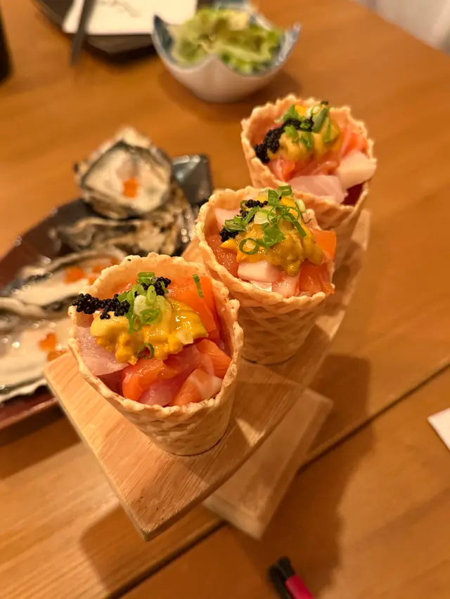 噚晚同朋友去咗一間日式餐廳食飯,一入門口就見到一個好有feel的設計,安排咗坐卡座,環境好舒服,店員都好友善,成晚好細心留意我哋需要,感覺好貼心~今次揀咗晚市120分鐘放題,包括咗唔同既野食。一開始來咗個和風沙律,另外仲有雜錦刺身盤﹑日本直送生蠔同埋精選串燒拼盤。些刺身都幾大塊,入口新鮮,串燒拼盤入面既燒菠蘿都幾好食。之後食咗個五色刺身海膽甜筒,呢個真係必食!刺身口感新鮮,海膽好鬼鮮甜,甜筒仲有陣蝦餅香味,最底仲有吞拿魚蓉,好高質!仲有個十二款手握壽司,有油甘魚,三文魚,八爪魚,海膽魷魚,青芥辣八爪魚等等;最鍾意火炙三文魚,油脂重,入口即化,而香蔥吞拿魚蓉就好清爽,口感又細膩。主食有兩款,煙燻麵包蟹同北海道蟹腳,當然兩個都要試下!麵包蟹煙燻味好重,入面有勁多蟹膏!北海道蟹腳好大隻,些蟹肉好嫩,肉質鮮甜,啖啖肉食得好開心!最後仲有個鍋物,叫咗海膽龍蝦湯底,配料除咗蔬菜,仲有宮崎A4和牛同埋北海道米豚﹑廣島蠔,海膽龍蝦湯底好濃郁又好夠鮮味,宮崎A4和牛肉質軟腍,北海道米豚入口都好正!全部都好有水準,食完暖笠笠好滿足。 查看更多
