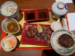 点了盐烧牛舌定食,套餐包含盐烧牛舌,白饭连迷你汉堡扒,一小碗咖喱,温泉蛋,沙律菜,萝卜牛骨汤。其中白饭,沙律菜,萝卜牛骨汤可免费逐添一次。埋单$120未加一。价钱尚可接受惟食物质素平庸。食物1. 盐烧牛舌质素尚可,惟有少许根。附带两碟酱汁,可惜酱汁调味失败,点完都唔知系乜嘢味道。2. 迷你汉堡扒质素尚可,调味略嫌太淡。3. 温泉蛋及沙律菜正常发挥。4. 咖喱冻的,0分。5. 白饭煲饭时落太多水以致十分soggy,湿到就快好似糊仔咁,难以接受,0分。6. 萝卜牛骨汤清淡到以为饮紧水以及不够热。2. 店铺环境座位少许狭窄,尚可接受。3. 总结价钱尚可,食物质素平庸,店家需认真打好基本功,尤其是白饭,食材的调味以及出餐时食物的热度。