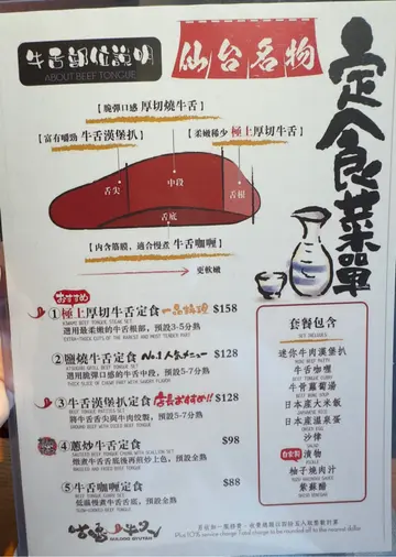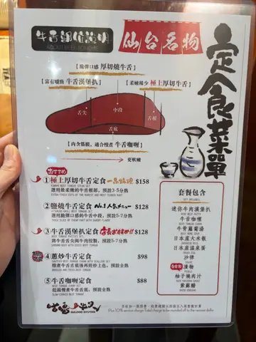 本身系牛舌嘅忠实拥趸。既然佢系牛舌专门店当然一定要去朝圣一下啦。我哋一共三个人,我哋三个人全部都嗌咗同一款套餐就系极上厚切牛舌定食喇~上网睇到佢嘅牛舌系可以又厚,烧到中间非常粉嫩,所以我都好期待直至到我𠮶一份嚟咗先。呢一份系我嘅,好客观大家都睇到首先有一旧非常之㶶同埋全熟,另外可能呢度睇唔清楚,我想讲我呢一份入边,有两件以上系头头尾尾,而且非常之干。坦白讲真系几唔开心,因为将近$200 一个餐,卖点仲要系牛舌,但系主菜牛舌嘅质素就系咁样。跟住我一路等,另外两位朋友嘅餐隔咗起码20分钟之后先再到。完全唔明点解第一个同埋第二第三个餐可以争咁远。以下呢一份系我朋友嘅。公平地咁样讲佢呢一份嘅质素我比$200我会觉得OK,而呢张相对面嘅另一份系另一位朋友嘅。我想讲𠮶一份比$200我都唔会嬲,但系我自己𠮶份我就真系嬲嬲地。店入边嘅环境唔系特别宽敞。如果卖点系食物而食物质素当然冇投诉,但系咁嘅价钱咁嘅食物,环境又唔系特别好。就真系唔会再有下次啰。睇埋套餐入边其他嘢。会有一个和牛汉堡嘅饭。汉堡入边粉嫩,味道都唔错。会有一只温泉蛋同埋会有一份咖喱俾你捞饭。你张相睇到我啲牛真系有啲嬲。有一小碗牛肉清汤。柠檬梳打系自己新鲜喺自己面前自己😂几得意,$25出嚟食饭,叫个饮品都预咗,所以呢个就冇乜问题。总结系真系唔会帮衬第二次,点知第二次会唔会又系咁差,希望餐厅可以保持水准统一,牛舌头尾嘅损耗,我觉得应该系由餐厅自己承担唔系食客同你承担。