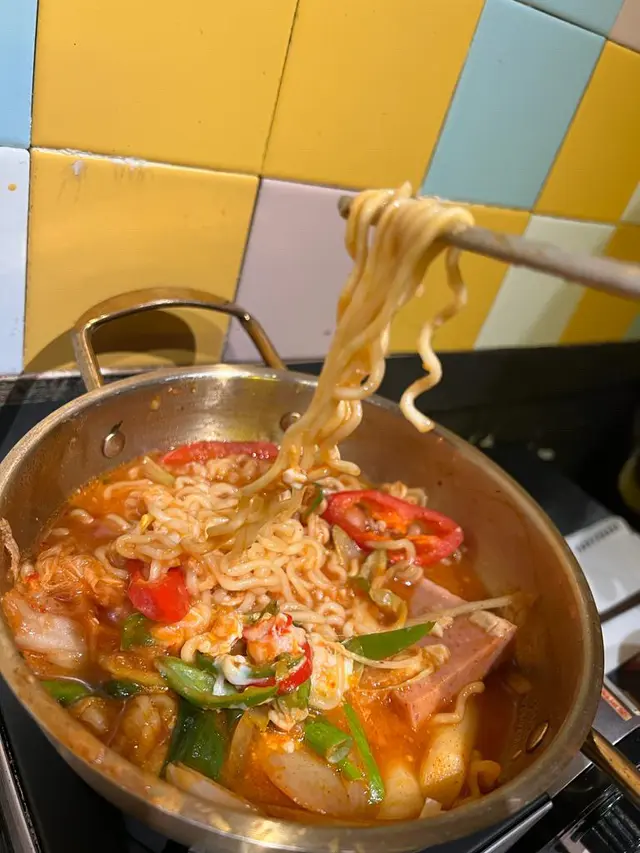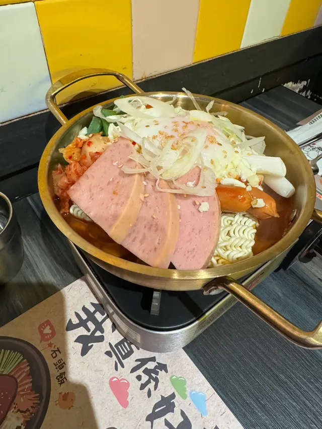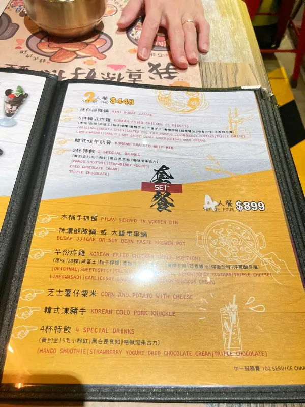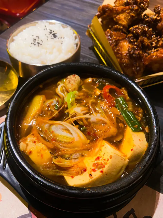 同朋友兩個人叫咗個二人餐,見都幾抵食,一人都係兩舊水左右👏🏻首先嚟到嘅係一個二人份量嘅部隊鍋,我自己好鍾意食㗎!雖然啲食材係啲咁簡單嘅嘢,但係往往配埋個好惹味嘅湯底加埋芝士同年糕,熱辣辣咁食係別有一番風味!🤣跟住上咗個韓式牛肋骨,上枱嘅時候熱辣辣出晒煙jar jar聲咁,一睇啲色水就知好入味!結果都冇令我失望,醬香味好濃!加上鹹甜鹹甜咁,like!❤️炸雞我哋一致揀咗甜辣味,我覺得係韓式炸雞既最好選擇,半份炸雞total有五件,都係新鮮即炸嘅!我個人貪心地認為如果可以配多幾嚿年糕就更好🙈🤣個set仲包埋兩杯特飲,我哋叫咗士多啤梨味同埋Oreo味,兩杯嘅甜度都控制得幾好,解渴得來又唔會太冰!整體嚟講都幾滿意,今餐嘅食物水準,而且啲店員都幾Friendly😘查看更多
