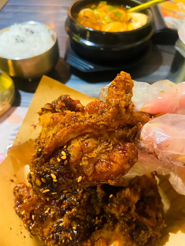 *尖沙咀韓國餐廳真係多到眼花花,好難揀啊~今次我地去左聽嗰名都知道係食雞嘅鋪頭— 咯咯雞韓食店,主打幾款口味嘅韓國炸雞,同時都有不同種類嘅主食。[ 蒜香醬油炸雞(半份)]· ✴️ 4.9 /5 ✴️炸雞有大概7-8舊,裹上甜甜醬油非常正,醬油之間有一粒粒嘅蒜粒,蒜味爆棚,超惹味🤩 炸雞肉質嫩滑,有汁~ 雞皮都炸得好正,超級脆![ 大醬豆腐蜆湯 ]· ✴️ 4.8 /5 ✴️天氣凍左好多啊,當然要飲翻d熱湯暖下嗰人啦☺️ 今次揀左非常經典嘅蜆肉豆腐大醬湯,微辣嘅大醬湯再配上白飯,真係十分上癮。入面蜆同豆腐都好多,仲有幾種菇,十分足料~ 冬天一定要飲佢!!查看更多
