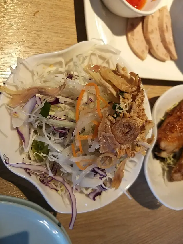 行完街找了間越南菜餐廳食晚飯。被色彩繽紛的霓虹燈門牌吸引。餐廳地方很大,容易找位置。小食要了酸辣無骨鳳爪。 辣度算適中,酸酸甜甜,十分開胃。配了蘿蔔絲洋蔥絲等,爽口清新。以優惠價加配的無骨鳳爪份量也不少。點了兩個撈檬。燒雞肉串撈檬。檬粉滑身,配撈檬汁唔辣,不錯。配菜足夠,有蘿蔔絲,青瓜絲,花生等。有兩串燒雞串,大大串,厚肉而且肉質嫩滑。燒烤味道惹味,沙嗲醬好配。蝦餅扎肉撈檬。蝦餅外脆內軟,蝦肉味道出,點少少甜酸醬帶出風味。扎肉厚切。一碗撈檬有齊兩款配菜。查看更多