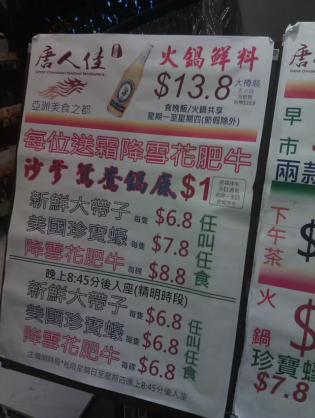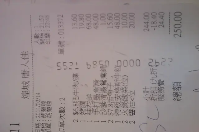 去香港旅游,酒店定在太子站附近,平时很喜欢吃港式餐厅,来到香港也要尝试一下啦!因为《唐人佳海鮮火鍋酒家》离酒店比较近,而且看价格不是很贵,就去了!其实吧香港餐厅价格和上海差不多,有时候算下来有的还比上海便宜,因为汇率嘛一个凤凰抓20多元,上海的避风塘也要这个价格,价格方面还算便宜,因为港币比例对与RMB来说还打了8折《唐人佳海鮮火鍋酒家》味道还可以吧~和上海几家港式茶餐厅差不多,喝早茶的婆婆公公比较多~有的婆婆还还热情大家都拼桌的,还蛮有趣的!在上海很少有拼桌的,都比较拘谨,香港可能因为人多,都要拼桌!不过我觉得这家餐厅的服务员态度不好,有点不耐烦的样子,难道是因为我们来自内地?还是因为太忙烦躁了?不解我看对面几桌也有一些来香港旅游的,可能因为周边酒店便宜吧?玩的挺开心的,物价比上海便宜多了!香港除了房价贵,真心比内地所有城市幸福啊!…查看更多