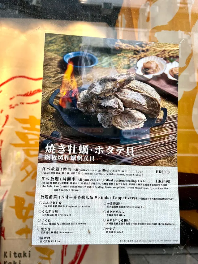 今次去咗中环嘅 「喜多嬉牡蛎屋」食生蚝放题,店舖细细间但舒适整洁,2人枱同4人枱各有3张,可以选择60/90分钟嘅牡蛎放题!我哋拣咗90分钟放题,包括可以任食生蚝、烧蚝、帆立贝、串烧、茶渍饭/乌冬等。放题一开始会送上叫「喜多嬉九品」嘅前菜,摆盘好精致啱晒打卡!有象拔邦刺身、秋葵天妇罗、妇罗紫苏叶吞拿鱼蓉,烧鳗鱼、月见烧鸟丸、牡蛎茶渍饭等!生蚝都算大只,系爽爽哋𠮶款蚝而唔系Creamy嘅,生蚝上面有土佐酢啫喱、萝卜蓉、葱,又或者可以整柠檬汁都得,海水味就无乜嘅同唔算好甜。其他烤物同串烧都正正常常,枱面配有蒜蓉、辣椒酱同类似沙茶酱嘅酱可以点,个人觉得秋葵串烧系最好味😆 …查看更多