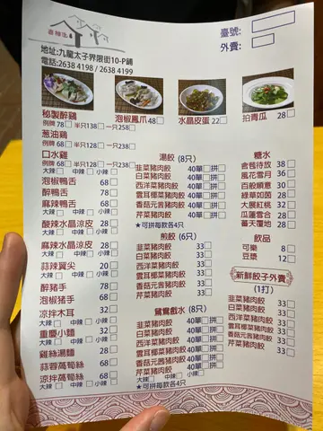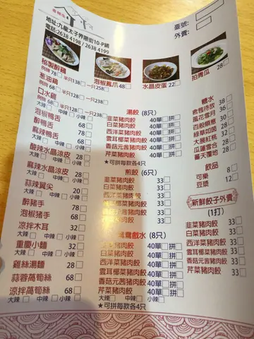 之前去太子食间西餐厅时已经留意到呢间门口装修的几中国式既饺子店。今日过开黎就去选择黎食下。呢度主要做外卖,堂食既话就要坐店铺外面既露天雅座。我地今晚黎到坐低就叫左一个前菜、两款饺子、一款肉类同两款饮品。凉拌木耳($32)呢个用左酸头、芝麻同少少辣椒,酸辣味道好啱我口味,够晒开胃!醉鸡($78)啲酒几浓而且几入味,鸡就唔太多髀位所以比较健康无咁肥。份量都几足架,两个人食真系差啲食唔晒。煎饺子($33)我地拣左白菜猪肉饺,煎得个底薄脆唔干,上面仲系好有水份,而且唔油。点啲红油辣酱都几正!汤饺($40)有八只,我地拣左韭菜猪肉饺同芹菜猪肉饺双拼。汤入面有四条生菜都几平衡。饺子真系皮薄馅多,好饱肚!饮品方面我拣左豆浆($10),朋友拣左可乐($8)。两样都系解辣好帮手。今晚隔离枱有成四五个人自带酒水黎食,似乎都几有feel!…查看更多