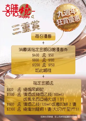 {劲食串烧 - $350/head}食串烧绝对有份魔力,本麻甩同女人谂唔到食咩时,都会谂起串烧,朋友介绍下去左呢间尖咀嘅喜膳烧,在饮啤酒前先食个饱饱先!叫咗超多嘢不能尽录,同大家介绍觉得劲正嘅几款先!♦️牛舌厚切牛舌有好多不同形式嘅呈现,呢度用一大片厚切,浓浓牛味,劲正!♦️烧扇贝烧扇贝个熟度刚刚好,同时又做到热辣辣,真系难得,蒜蓉同埋芝士各有风味,两样都好食!♦️烧濑尿虾干正呀,唔洗去大澳都有我食,份量唔少,条条都脆卜卜劲香虾味!♦️芝士焗蘑菇大啡菇好香浓,个芝士邪恶到我不得了,系香脆架,呢个真系必点!♦️九转烧肥肠邪恶不一定是芝士,爆发性油香,烧到脆卜卜!♦️劲辣金钱肚串烧少见嘅产品,辣粉藏在肚入面更嘢味!♦️烟肉鹌鹑蛋用香脆嘅烟肉包住鹌鹑蛋嚟烧,口感嘅层次令人难忘味道亦都好唔错!整体嚟讲所有嘅食物质素都唔错,如果大家下次喺尖沙咀谂唔到食乜一定要去下呢间正正串烧!美味程度:😋😋😋😋😋环境指数:🎇🎇🎇🎇番食机会:🦍🦍🦍🦍🦍📍 #喜膳烧 (尖沙咀)尖沙咀宝勒巷10号地舖…查看更多