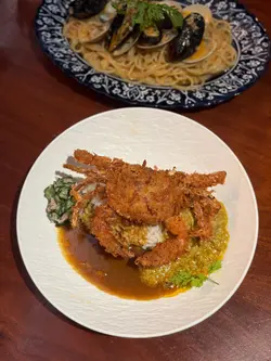 咖喱牛肋肉蛋包飯,紫薯牛乳,和牛漢堡薯條, -