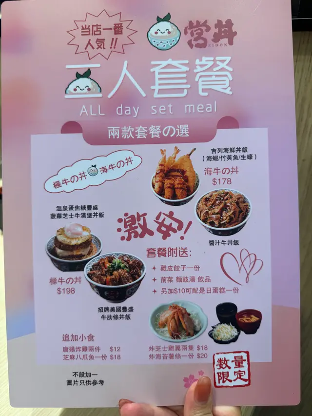 話說原來上水開了這間專做日式丼飯烏冬快餐的餐廳,選了一套兩人海牛之丼餐,包兩個主飯及前菜、一份雞皮餃子,以及麵鼓湯與飲品。主飯分別是醬汁牛丼飯以及吉列海鮮丼飯,海鮮丼料多豐富,有一條竹萊魚、兩隻炸蠔和炸蝦。因為炸物看起來大大份的,熱辣辣的外層酥香又新鮮炸起,於是還加點了3道惹味小菜,有炸芝士雞翼與海苔薯條和唐揚脆炸雞,炸物香脆惹味,是套餐的亮點之一。另外前菜的性價比也是大胃王的恩物,有雜菜薯仔球一大顆,伴飯食或者單食也很飽肚滿滿的。而甜品方面亦超級便宜,只需加10元一份。種類是隨機提供的,今次嘗到了忌廉卷以及提米拉蘇,一口氣滿足了對日式甜食的執着,又與炸物搭配相得益彰,大滿足是也!…查看更多