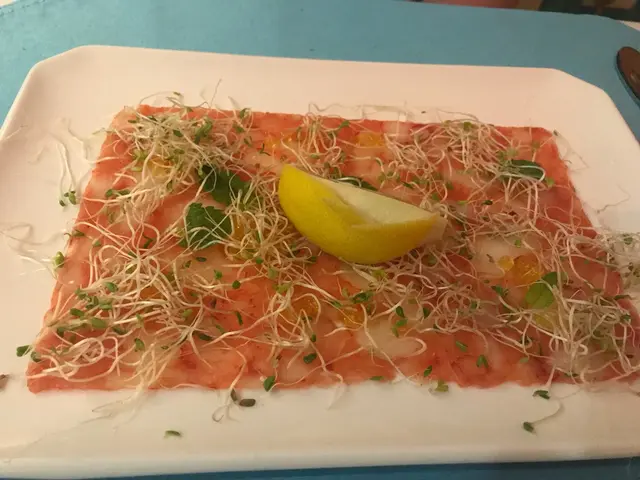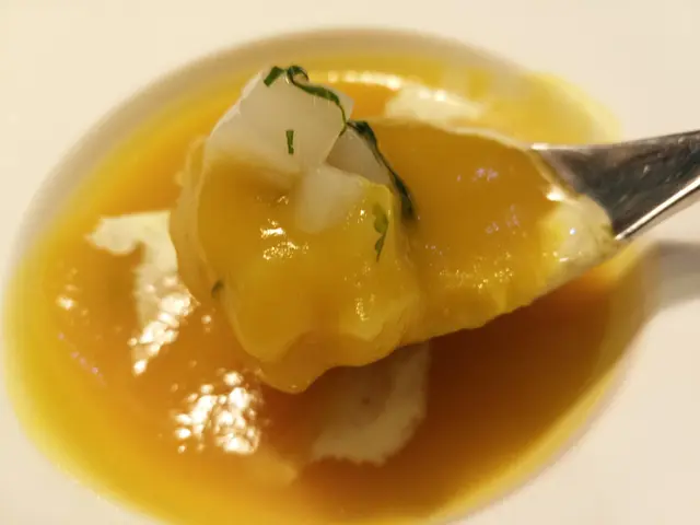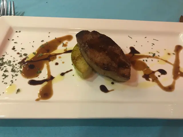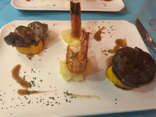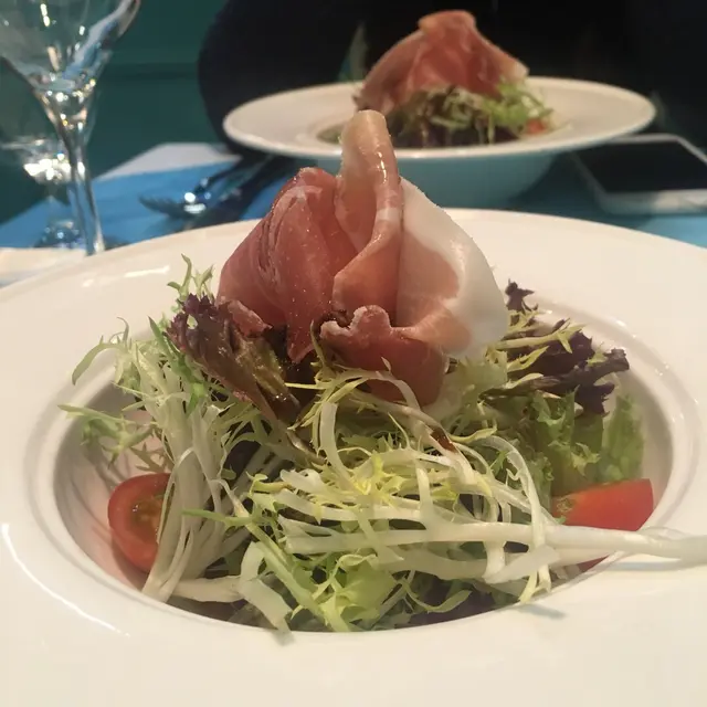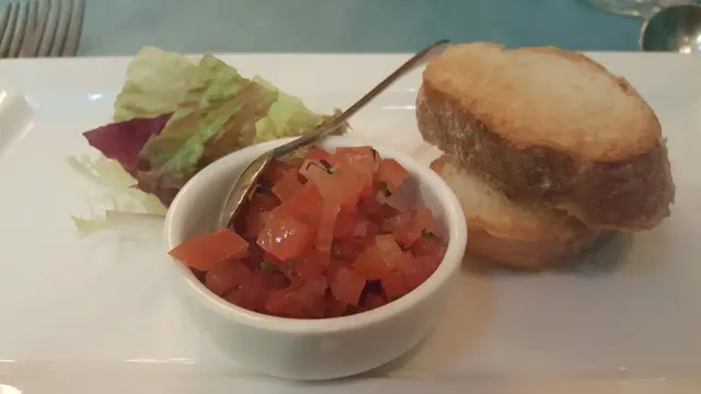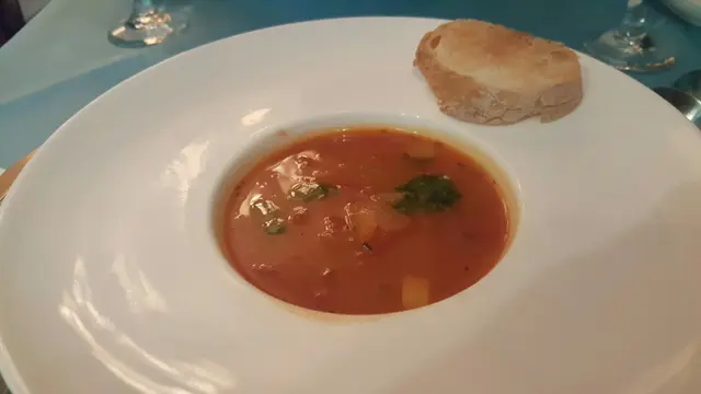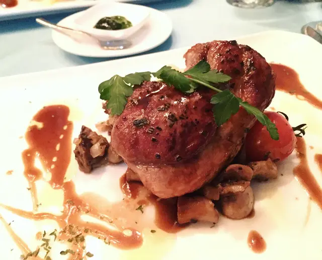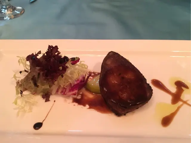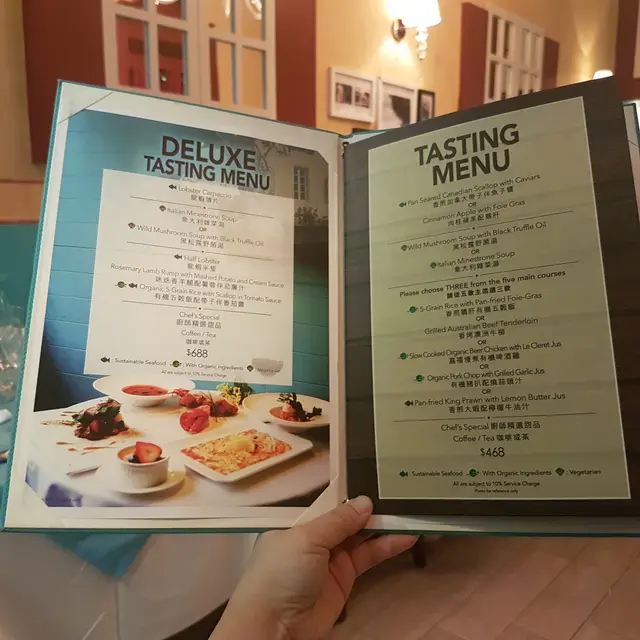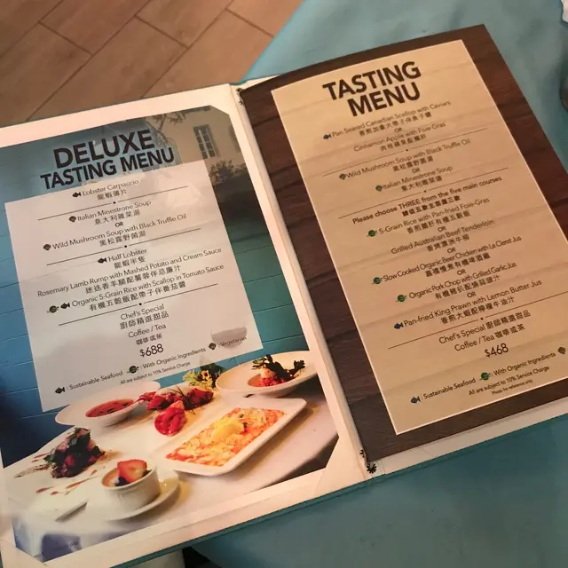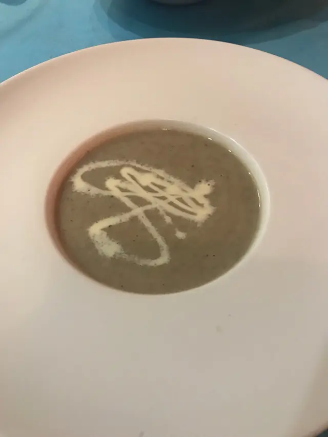 好有心既友人專程黎到公司等我放工請我食生日飯,八點半到達呢間Tiffany blue既餐廳,枱唔多,唔夠十張枱,環境尚算舒服,坐低order 左佢個tasting menu, 同埋散叫左個M7牛扒加3個course...叫左黑松露蘑菇湯,前菜有龍蝦薄片同埋蘋果鵝肝,湯同鵝肝都好正,松露味好香,鵝肝有質感而且同蘋果配合得好好,友人既龍蝦薄片賣相唔錯,不過佢話味道有d 奇怪
