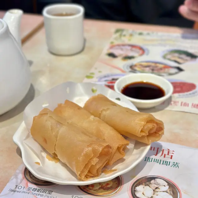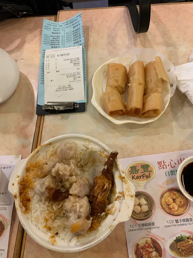 自從出左消費券之後去到邊飲茶都好多人😂放假想飲茶,黎到九龍城見到嘉豐唔使排隊直接可以入座,不過入面都幾乎full晒🫣每人茶位$6,叫左幾款點心,都算黎得好快▪️蒜香蝦春卷 ($27)熱辣辣炸起好香脆,蒜味又夠香,有蝦肉👍🏼當然要蘸埋喼汁😋▪️原隻鮮蝦腸 ($29)可按自己喜好加豉油,腸粉皮薄又滑,蝦都幾大隻!▪️蜜汁叉燒包 ($22)叉燒既肥膏多左少少,不過整體味道正常既▪️魚肚滑雞札 ($29)除左魚肚,腐皮入面仲有一塊雞肉、火腿同芋頭條,食雞札主要為條火腿😆好彩無轉成蟹柳。而魚肚索晒汁,juicy又好食▪️蟹子燒賣皇 ($31)飲茶必叫😗燒賣都幾大粒,我個人黎講就中意蘸啲辣椒油食▪️足料糯米雞 ($33)超大隻😂而且有好香既荷葉味入面有雞肉、臘腸同原隻鮮蝦,好食既,係鹹左少少🤏🏼一路食keep住見到有人入黎,亦有唔少外賣,睇得出深受街坊喜愛🤭不過環境上係比較窄同嘈少少既,唔好expect會好似出面酒樓咁坐得好舒服既感覺。查看更多
