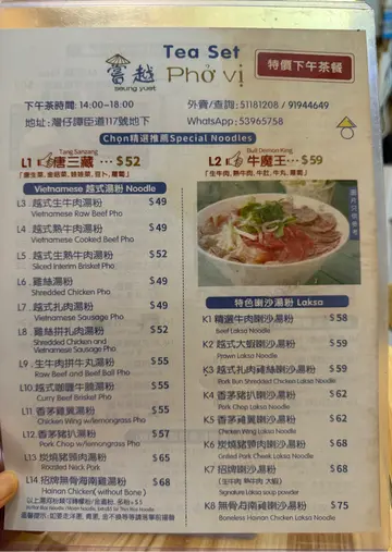 #尝越 之前去咗湾仔食咗一间越南餐厅下午茶,本身想叫生牛肉汤河,后尾见到有一个贵十蚊叫牛魔王,包括生牛肉,熟牛肉,牛丸同萝卜,$59 跟一杯热饮,决定一试。个碗望落几大碗,汤底够味,不过唔够热,唔知系本身唔热定系大风口下吹冻咗。但正因如此,生牛肉冇即时变成熟牛肉,仍然系保持生牛红色既状态,慢慢漫熟过程中非常嫩滑。熟牛肉其实系牛腩片,肉味香浓,有少少咬口,几好食。牛丸唔知系比少咗定太贵,竟然只得半粒,一啖食完冇乜特别都未食得真就冇咗。萝卜有两细件但完全唔够身,仲系比够硬唔够入味,唔得。河粉都几唔错,加埋酸汁更惹味,酸辣度唔错。整体无论系生牛肉定熟牛肉都好食,下次有机会再嚟嗌呢两样$52下午茶都系一个唔错选择。尝越湾仔谭臣道117号地下B号舖…查看更多