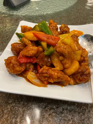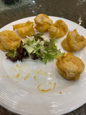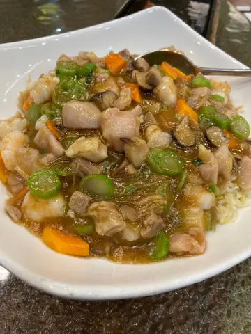 牛年第一次和朋友们聚会,趁著晚市回复堂食,我们预订了一家位于尖东的中菜馆。它位置方便,于尖东站旁边,而且是地铺,很容易便找到。这里装修一般,但餐具有一些有趣、别致的手绘图案,十分罕有。趁新一年来临,我们点了丰富的菜色:铁板蜜炙叉烧皇鲜红的色泽,加上泛起点点油光,令人垂涎。叉烧不带肥膏,切得厚身,啖啖肉的,而肉质软腍,蜜糖味甜美。鱼香茄子煲热辣辣,带点咸香,很有风味。茄子软棉可口,充满一丝丝的甜味。蒜香脆皮烧鸡(半只)外皮烧得香脆,香喷喷的,鸡肉仍嫰滑有鲜味。黄金虾球一共有8只 (拍照前已吃了2只呢),表面的脆皮有「起沙」的口感,蛋黄味浓郁。虾仁够大只,虾肉爽口弹牙。米网咕噜黑豚肉橙红色的酱汁,远远也嗅到它酸酸甜甜的气味。咕噜肉够惹味,豚肉腍身松软。配菜有菠萝和三色椒,增添了清新的感觉。福建炒饭最后当然要叫米饭才有饱肚感。外观不俗,颜色算丰富。亦有很多配料,包括虾仁、鸡肉、瑶柱丝和菜粒,配料比炒饭还要多呢。吃过这餐愉快的开年饭,祝大家牛年丰衣足食!…查看更多