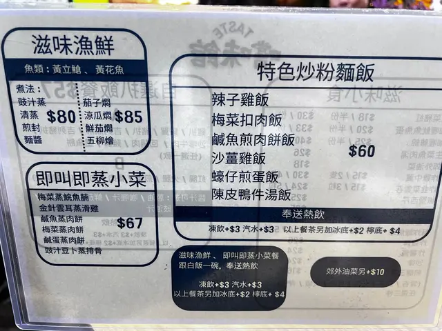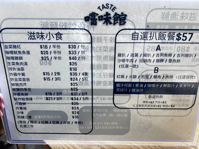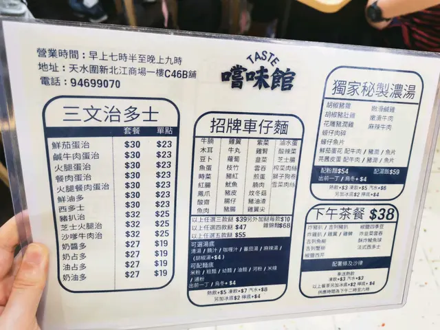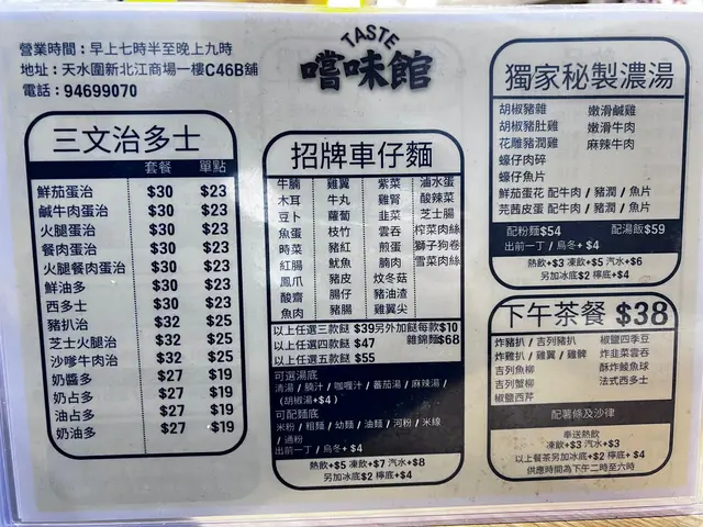 嚐味館 (天水围) 网址: https://s.openrice.com/QrLS0W8mC00 地址: 香港天水圍天湖路1號嘉湖新北江商場一期1樓C46B號舖 电话: +852 94699070