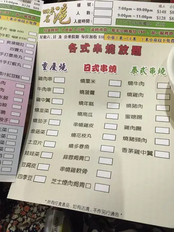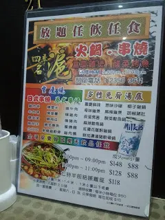 太和附近的街市上面有间新鸡煲放题(其实都开了一段时间)食到太和那么远, 既然是放题~要吃到尽啊! 选择并不多, 但除了鸡煲火锅配料, 还有串烧可以点 最快熟的除了肥牛, 就是鱼皮和竹笙啦,吸收了汤汁后非常好吃, 难怪一直竹笙都是谭仔必点!鱼皮不要煮太久, 10秒8秒就好好吃!肥牛真的好看运, 一转一转的, 有时真的一般, 有时就超红润好香牛肉味, 非常好吃!烧年糕意外地很JUICY, 少量甜酱加疹在上面突出整串年糕的口感 猪颈肉也很不吝惜非常多, 用了麻酱所以很香口, 不过也很肥呢~鸡翼都好大只好饱满, 不过一串只有一只啊, 想要就多点几只了 青口还只是一般的货色, 用来打边炉比较好 这是熟云吞啊, 非常大只而且很多涵!从外皮就见到它有多厚呢,皮咬下去折位没有很厚粉的感觉, 很不错!这个是腌韮菜, 就是很一般了, 不过想不到连韮菜可以烧!