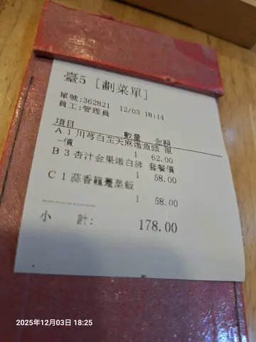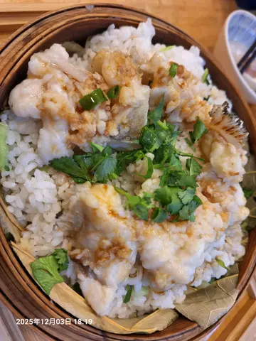 行经大坝街,见到呢间小店有好多套餐,有鲜鱼汤饭/米线,笼仔蒸饭,不同种类客饭,仲有多款炖汤选择呢度所有饭餐加多$10就可以饮炖汤,两点半去到冇乜客人,今次叫左蒜蓉笼趸蒸饭$58,等左大约十分钟就上枱蒸饭有蒽粒同菜,加埋有豉油兼啱啱蒸好都好够热,笼趸件有七至八件,鱼皮都几厚骨胶原都好丰富,笼趸肉鱼味都几好,鱼肉食落都几滑,加埋蒜蓉粒一切食,都好鲜味下次会试下其他总类海鲜如白鳝,蒸虾,或者饮下炖汤呢度地方细细,环境卫生普通,但胜在食材新鲜价钱唔太贵