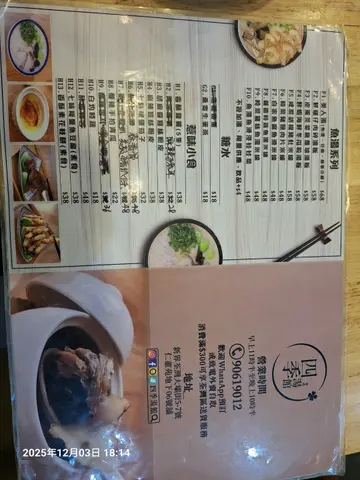 四季湯館 (荃湾) 网址: https://s.openrice.com/QrLS03mmA00 地址: 香港荃灣大壩街5-7號仁蕙苑地下6號舖 电话: +852 90619012