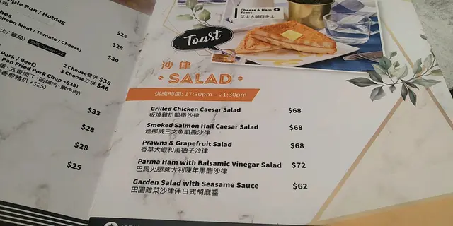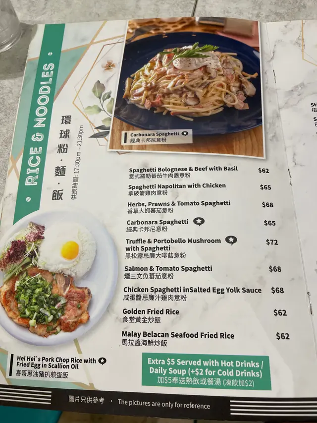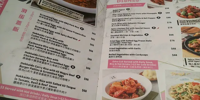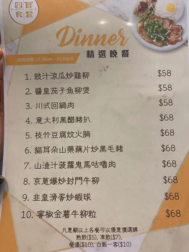 朋友知我一向愛去茶記,推薦我試吓「四寶食堂」,不過,時間過吓過吓,無咗回事,亦完全忘記咗。早前,過嚟搞啲保險嘢,見到「四寶」就醒番起,今晚就喺專登約個舊同學聚一聚,食餐茶記便飯。 簡潔嘅餐廳門面睇落好醒神,室內打橫長形,主色調用上湖水綠,加上光鮮整潔,清爽舒服,霎吓眼仲有種優雅咖啡店嘅感覺,而唔似茶記。見到有食客食完,店員除收拾餐具外,仲會噴灑消毒劑清潔枱面,更感餐廳注重衛生。 雖然話喺茶記,睇完主餐牌就有種非一般茶記嘅感覺,因為,唔單止見慣見熟嘅港式嘢,如小食、炒粉飯麵、小炒,仲有薄餅、滑蛋蓋飯、特色拌麵……等等。 另外,仲有一紙底面兩頁嘅晚餐,一面喺晚市常餐,另一面喺小炒晚餐,但要留意,後者話就話叫喺晚餐,但餐湯、白飯、飲品均要加錢另配,咁……就唔叫得喺餐喎! 港式什扒 $98友人喺食肉獸,所以,一早就睇中啲扒餐,選呢一款有雞扒、薄牛扒、火腿扒、司華力腸嘅港式什扒,佢話有啲緬懷感喎。配埋薯角,果然喺大堆頭,食到佢話好飽,質素亦都唔錯,見條司華力腸鎅晒花,都俾高少少分。不過,佢話兜黑椒汁又唔使俾到咁大碗,此外,如能以鐵板上就更有感。 喜哥蔥油豬扒煎蛋飯 $62呢款喺朋友推薦我試,話塊豬扒勁大又鬆化,所以,就投其一票。嘩!又果然真喺好大塊,而且幾厚身吓,冚晒成個飯面,的確,啲豬扒煎得甘香,咬落質感鬆化富肉汁,不愧喺店家嘅招牌推介菜之一;更俾咗好多蔥油,而太陽蛋煎到蛋黃盪吓盪吓,啱晒我,蛋黃蔥油撈飯,一流呀喂。 熱奶茶 +$5我個飯喺散點,唔包嘢飲,嗌熱飲或餐湯就要加$5。熱奶茶喺去茶記嘅一貫心水,呢度嘅奶茶都唔錯,有茶香,唔單薄,口感亦算滑。 而友人就要咗凍檸茶少冰少甜,果然喺少冰少甜,兼夠多檸檬。啲阿姐招呼都幾好,地方又衛生整潔,唔知喺咁啱定喺店家嘅一貫服務要求,我哋所點嘅主食,都喺同步送上枱,有別一般茶記有咩出咩,呢個亦喺加分位。查看更多