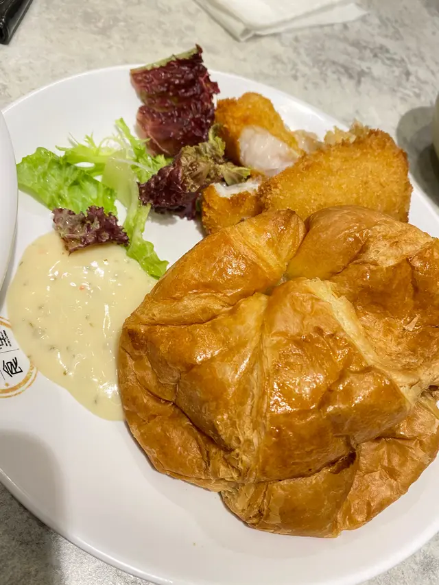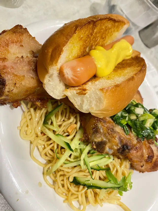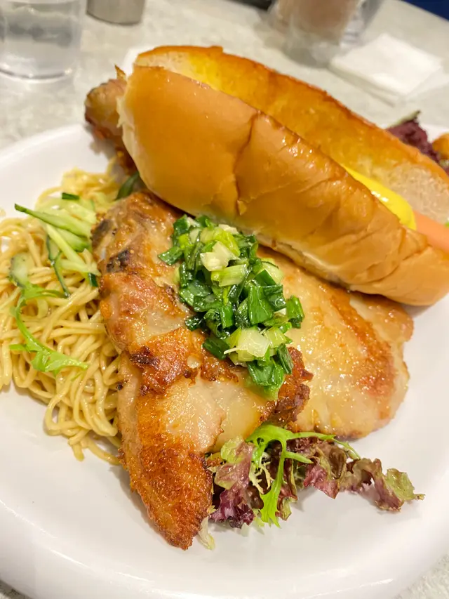 近排好似好多地方都有四寶食堂嘅分店,今次就嚟到天后呢一間試吓。入到去環境都幾乾淨,座位闊落,全程都坐得舒服。附近好多日都係食緊小菜,今日就試吓佢個常餐先,佢個常餐有得配熱狗、牛角包或者奶油豬。我叫咗個蔥油豬扒拌麵配熱狗,同埋忌廉烏冬配火腿芝士牛角包。價錢唔記得咗係$68定$78🤣🤣。一嚟到佢個蔥油豬扒真係嚇親我,完全係加加加大碼,超級抵食!食落豬扒唔會太硬,好鬆軟,外面煎得好香!蔥油都好香,用嚟拌麵一流個熱狗就不過不失啦,正常至於個忌廉烏冬都好好食,烏冬好煙韌,醬汁唔會太浠又唔會太稠糊,掛落烏冬到岩岩好,味道都好好,唔會太淡太咸。烏冬跟餐嘅火腿芝士牛角包🥐,好大件好軟熟,夾埋芝士火腿一流!❤️下次再嚟嘅話會試吓佢嘅小菜,齋睇人哋食都覺得好夠鑊氣!😋😋查看更多