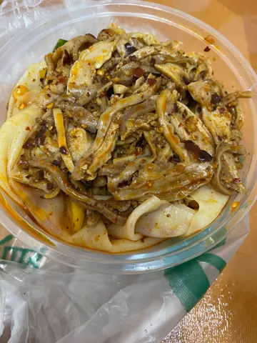 宽阔粉皮爽弹挂汁。辣味余韵犹存