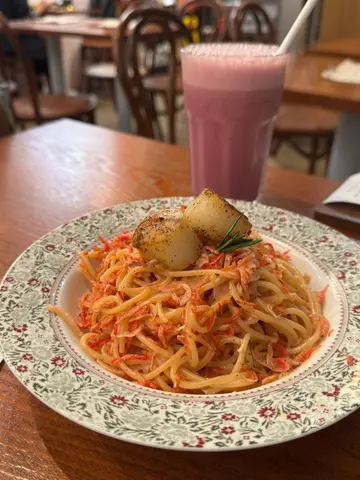 餐厅虽然座位唔多,但胜在环境设计简约,坐得舒服,可以让我地远离市区既局促感。今次我同朋友都叫了意大利面,另外加特制饮品同一道甜品。卡邦尼系我最爱既意大利面,每次食西餐我都必点。今次既卡邦尼味道比较特别,叫流沙温泉蛋卡邦尼意大利面,加入了大量芝士同烟肉,所以味道较为浓郁,适合喜爱浓味既食客。而另一款樱花带子奶油意大利面就较为少见,中间加入了樱花虾,味道鲜美,令整道意粉充满住香浓的虾香味。意粉上亦放置了两粒煎香的带子,咬落鲜甜惹味,而且大大粒,爽口弹牙。至于甜品,自家制开心果巴斯克芝士蛋糕绝对不容错过。平时食原味巴斯克蛋糕较多,开心果加芝士味都系第一次食。外层微焦,内里浓郁,口感绵密。开心果的甜味与芝士的咸味出奇地夹,而且蛋糕非常松绵,值得一试