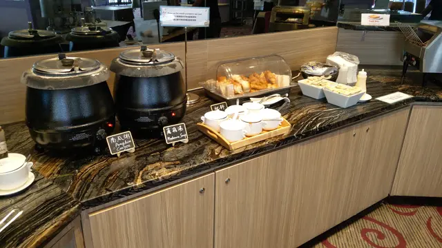 我們第二天早上走到帝盛酒店1樓 <圃公館>!當時,限聚令下每枱只限2人!食物以中式及西式,款式不多!提供每人兩個食物盒,兩個紙杯及餐具,攞早餐返酒店房食!當我得知酒店安排,我自備紙碟以便影相,賣相更好!