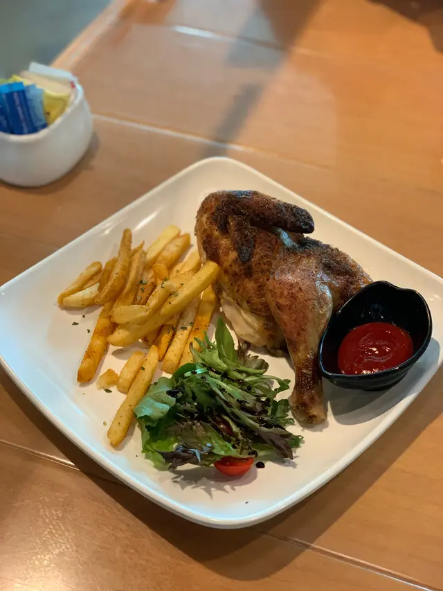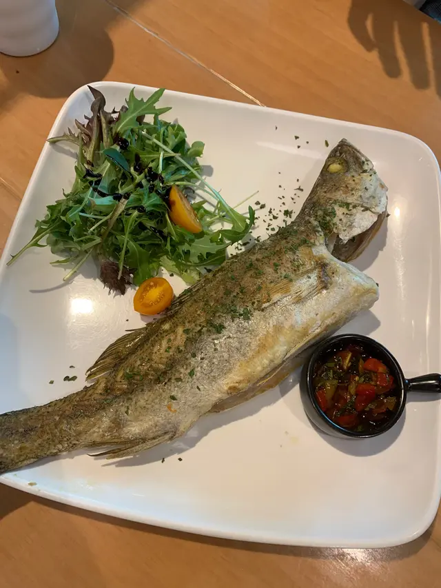 Lunch hour 去呢度食飯~ 環境幾舒服 喺浸大嘅餐廳 座位都算幾多~香煎原條鮮魚配蕃茄莎莎醬($118)首先呢個要等耐啲嘅 都等咗成半個鐘 條魚都幾大條 雖然肉就唔多啦 番茄沙沙醬好小 根本唔夠點全條魚 🥲而且冇咩味 唔係好搵到莎莎醬喺邊🙃🙃 到條魚啦 外皮煎唔脆唔香口 一啲都唔滑 仲腥腥地... 而且價錢都偏貴 香辣烤雞伴卡津風味薯條及沙律菜($80)香辣粉同five guys 嘅 Cajun 薯條係一樣㗎😍所以都幾好食 加分~ 而且隻雞好滑 咬落都幾Juicy (除咗個骹位比較鞋)同埋分量都幾大 一定夠飽!查看更多