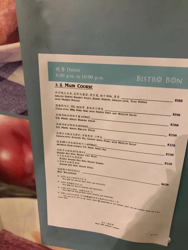 位於浸大由小小虫開既bistro bon唔洗學生都可以黎到既之前見過佢告急加上自己有野想慶祝所以特登幫襯下由九龍塘黨鐵站行過去都比較遠都要行成三四個字早幾日book左1930呢個時段星期五夜晚未坐得滿地方算大都幾多檯有個開放式廚房不過地下就痴lumlum好似好耐都無抹過咁餐牌都多野揀主菜可以再加68蚊配前菜,湯同野飲仲可以再減12蚊一份甜品環境一般不過我地兩個人坐四人檯就坐得好舒服送左兩件好普通既麵包是日餐湯OK既但有少少苦另一個前菜係溫泉蛋炒菌呢份口感幾特別我地主菜就訂左兩個隱藏menu威靈頓牛同西班牙海觧飯其實由確認訂位到入門口佢地都有勸喻過我地份量太多會食唔晒不過呢一日有紀念價值女朋友又一意孤行就交由佢發辦首先上既係威靈頓牛加埋一都成七舊水賣相唔錯不過都係有甩皮甩骨既情況出現其實之前都只係曾經係gordon ramsay海港城間餐廳食過一次呢個味道都可以但因為只有兩個人食每人三件真係食到第二件都開始濟另一個係西班牙海鮮飯menu係無既直到兩份都上晒檯我終於明白到點解佢地係咁不斷咁勸喻我地因為份海鮮飯真係好大份其實本身食威靈頓牛已經濟濟地不過既然一場黎到都叫左當然都係會清晒佢啦呢個海鮮飯都好足料比起牛係好食既但都真係二揀一就夠兩個都真係四人以上既份量黎開心嘛所以仲可以食埋甜品甜品有四款全部都唔貴我地一人叫左一款伯爵茶奶凍可以做到動L效果都唔錯另一個係tiramisu呢個樣好靚手指餅用黎點咖啡又得點蛋糕亦得其實後尾餐廳都爆爆地份量太多都食左成兩個半鐘呢度算係學生飯堂並唔係高級餐廳無時間限制亦都可以高談闊論女朋友就鍾意呢種地方多過米芝蓮餐廳唔洗避忌不過呢餐價錢當然係貴到hihi兩個四人份量既主菜跟一個set再加兩份甜品埋單差唔多千四蚊仲貴過去食米芝蓮味道方面唔算特別好食環境亦都有待改善當係支持下黃店聽講小小虫會開分店如果就腳d可以試下查看更多