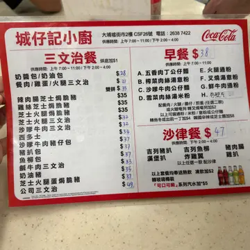 印象中好像没试过在大埔新街市这里食过早餐,只在午市及晚市会光顾,所以问我早餐有什么好吃的话,我也数不出来!是日相约亲戚吃早餐,而之后紧接有其他节目,为方便他泊车而决定在新街市食早餐吧!大家不想饮茶食点心,又不想一清早食猪扒面,随意的就拣了这家城仔记小厨!逢去茶记都多点常餐,这次也不例外!由于早两天才吃公仔面,所以是日没选沙嗲牛肉公仔面,取而代之是叉烧意粉+火腿奄列+牛油多士!另叫了杯冻柠茶~~转奄列及叫冻饮都要另加钱啊!多士够牛油香又够脆,奄列有足够火腿丝,又带蛋汁,不会煮得太老~~叉烧意粉,叉烧质素普通,质感不会太韧太粗糙,过得去!汤意粉的质感滑溜,不会糊糊的,汤底亦不会过咸,味道ok!亲戚分别食沙嗲牛面及猪扒公仔面,他们都觉得ok。沙嗲牛面的沙嗲够味而牛肉软稔,猪扒亦松软易咬~~冻柠茶的茶底则不够香浓,没有回甘味~~整体来说,食物不难吃,但也算不上特别出色好吃,是可接受的程度啊!Read More