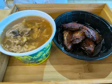 我都估唔到在山顶游客区, 竟可以有咁高CP值香港地道食品, 而且又有咁嘅水准, 首先在山顶广场食店林立, 而这所城寨风味又并不是有一个独立舖位, 而座落在一个像food court的商场内, 反而他的座位更有特色, 又可以打卡, 但当然最重要就是食物质素, 他有整个山顶广场都没有的香港地道食物, 包括碗仔翅、手撕鸡、咖哩鱼蛋、混酱肠粉, 而我今次就试了他的套餐咖哩牛肋骨饭, 想不到咖哩和牛肋骨都很惹味, 而他的那个冷盘手撕鸡, 也很出色, 碗仔翅就相当足料, 另一个瑞士鸡翼绝对抵食, 套餐还可以加十蚊换一樽地道花茶, 能够在山顶一面欣赏景色, 一面享受香港地道高质食物, 实在是一乐也。…查看更多
