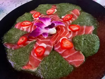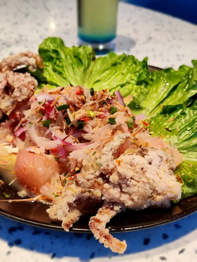 Asahi draught朝日生啤,日日系舖头不停饮已经不太想饮,免强一杯湿湿口吧。原只椰青,室温?失温?不冰冻的椰青水,不过不失。泰式冬荫功卡邦尼大虾意粉⭐️⭐️⭐️⭐️⭐️虽然有诚意有质素,不过售价二百多元真心贵。先做好预备工作,将蛋黄跟意粉及芝士捞得平均,每条意粉都要挂满汁液方算成功﹗卷起大大啖酿入嘴仔,冬荫功汁十分浓郁黏稠,奶甜味突出而散发轻轻辣味及强力酸味,蛋黄作为平衡的角色,完成度十分高,开胃醒神。泰式炒通菜,咽韧带硬的旱通,不及夏日时令浅绿水通爽甜多汁,味道狂野香浓带辣带蒜甜。泰式炸虾饼,卖相不讨好,油光闪闪。咬落面包糠粗糙刮嘴,虾胶鞋烚烚无鲜味,松散不起胶。火山排骨⭐️⭐️⭐️⭐️真正的泰式火山骨﹗跟在曼谷食的都有几分相似,全部用龙脊骨,不是猪肋骨。炆得肉质弹牙,淋上泰式酸辣汁,完全渗透骨中肉中,损得非常畅快﹗整碟只需要我一人之力便可以完全消灭。泰式生虾刺身⭐️⭐️⭐️大家都非常喜欢干冰喷烟的演释,视觉效果一定加分﹗鱼露浸的即食生虾刺身可以,及埋蒜片辣椒加上泰式酚辣汁的加特,合格。泰式烟熏三文鱼刺身⭐️⭐️⭐️⭐️本身三文鱼反货时已烟熟,上枱时再烟多次,黎招双烟熏,做足工乎,虽然在味觉及嗅觉上没什么帮助,不过视觉上有加分的。绵绵的烟三文鱼充满咸鲜,有著芫荽泰汁及蒜片辣椒的助攻,比预期中美味。基地龙虾泰式秘酱炒饭,应该命名为泰式焗波士顿龙虾伴基地泰式炒饭⭐️⭐️⭐️比龙虾意粉更贵,接近三百大元﹗波士顿龙虾真的很鲜爽弹,处理得而仲保留鲜味。炒饭完全食不出什么秘酱那么神化,其存在感薄弱直头无乜味道。…查看更多