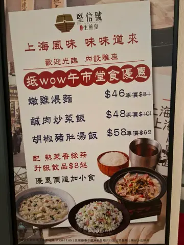 呢次去咗大角咀坚信号食饭,想分享下感觉,啱晒大家参考!餐牌上叫咗他们招牌的豉油鸡饭套餐,配埋生煎包同溏心蛋,成个餐$65,好合理,份量够晒饱。鸡肉好滑,酱汁味道够浓,姜丝落得啱啱好,饭就有丝丝青葱,都几清新。生煎包咬落去外皮有少少脆,入面肉馅都几juicy;溏心蛋就好细心,冧身但唔会过咸,正!最唔方便的地方系要搭枱,人多时冇得自己拣坐得舒服啲,但就环境都算干净,店员态度都几友善,无特别催客。如果你想揾返啲地道快餐、舒服食物,呢度都值得一试。不过介意搭枱可以谂清楚先嚟
