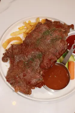 今日午餐嚟到坚尼地城觅食,响呢间位于卑路乍街既坚尼地冰室食个午餐。午餐时段到店,坐满八成食客,揾到张二人空枱坐低,扫码睇下个餐牌有咩好食,都系西餐厅既大路野,最后点咗呢个香煎美国西冷牛扒配薯菜,先嚟个杂菜汤,酸酸甜甜,好开胃,跟住上个扒餐,牛扒薄切大大块,三成熟,软腍有咬口,牛味弱咗d,薯条热辣辣,点茄汁食另有一番滋味。[米饭]口味:🥚🥚🥚[薄荷]环境:🥚🥚🥚🥚[服务铃]服务:🥚🥚🥚🥚[糖果]性价比:🥚🥚