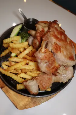 坚离地冰室名改得非常妙,令人不禁想冰室到底可以有几坚离地?直至去到用餐便知,以西餐来讲非常贴地,但以冰室黎讲就坚离地,因为佢系西餐水准!但系价钱却也非常贴地,难怪件事变到咁坚离地,坚离地居民都几有口福~🔸新奥尔良烧春鸡蝴蝶型扒烧春鸡,香料香口,大件夹抵食。🔸酥皮罗宋汤呢个价钱都饮到酥皮汤,酥皮都算酥,罗宋汤也够味。🔸脆皮德国咸猪手猪手Size适中,皮够香脆,性价比高。🔸法式鹅肝煎牛柳配黑松露烧汁香煎牛柳上伴上鹅肝,煎得恰好,最重要价格极度抵食。🔸金莎薯条经典款扭扭薯条,配上咸蛋黄金莎,非常香口。🔸香煎鸡扒凯撒沙律鸡扒大大块,皮煎至金黄,凯撒沙律大大份,抵食!另外仲有好抵饮嘅红白酒。