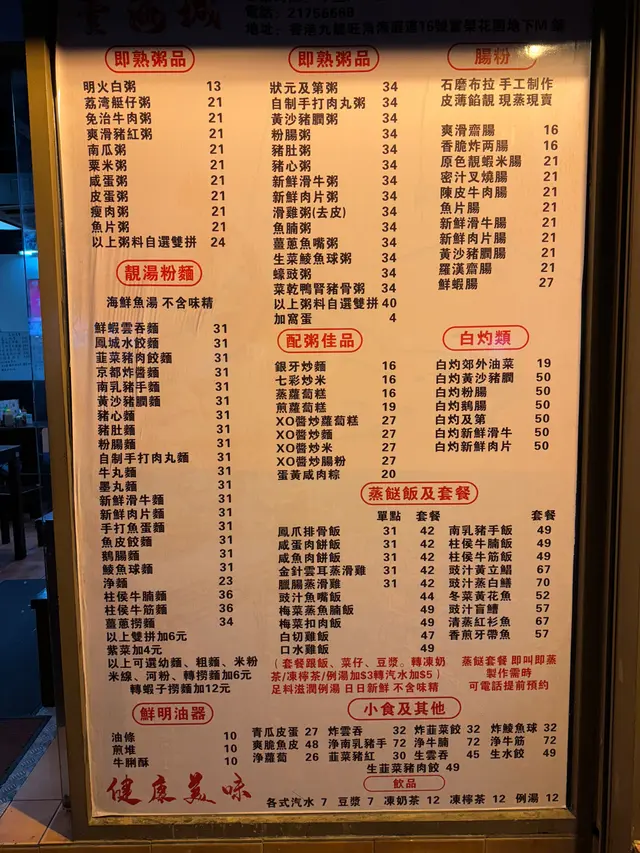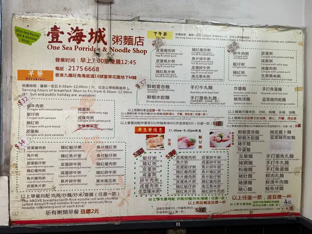 壹海城粥麵店 (大角咀) 网址: https://s.openrice.com/QrLS0IjC700 地址: 香港大角咀海庭道16號富榮花園地下M號舖 电话: +852 21756668
