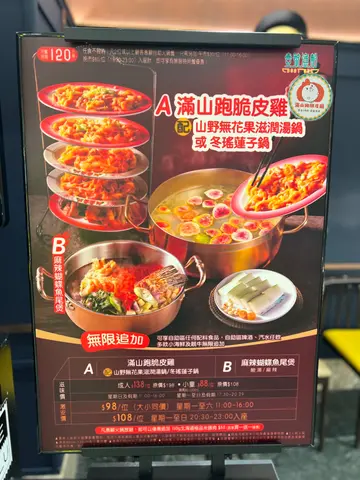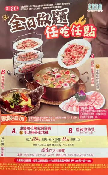 壹号渔船 位于旺角荷李活商业中心, 人气地点, 交通极方便. 此店在 2 楼, 很有规模. 面积大, 渔船形的大鱼缸, 海鲜生猛活跃. 餐厅设计明亮整洁, 通道阔, 有窗边梳化卡座, 大圆台. 空调好好, 无油烟味. 店员 招呼好有礼貌.我们订了位, 准备食个放题火锅 120分钟套餐. 星期六日 成人全日任食不限时段, $138/p. (午市加 $30, 晚市加 $60 无限时饮食优惠) 星期一至四, 只系$98/位.放题锅有两种选择, 我们拣了A餐: 山野无花果滋润汤锅 满山跑脆皮鸡.侍应有效率为我们安排座位. 汤锅及五盆鸡件立即送上.逛逛自助饮品物区, 大型雪柜多个, 饮品任饮, 有啤酒, 气水, 果汁, 竹蔗水, 健康茶...., 我们取了冰冻啤酒, 气水.熟食区有烧鹅, 牛腩, 花生炆猪手, 炸虾. 自助酱料区, 摆设整洁卫生, 有辣有吾辣, 自由添加. 火锅配料可以到冰柜自取. 有鱼蛋, 鱿鱼, 鱼/牛/猪肉丸, 菇, 菌........时蔬, 云耳, 淮山, 腐皮, 生根, 生菜, 南瓜片........ 蔬菜新鲜摆放得好整齐.另有3 个凉食: 凉伴云耳, 蕃茄.泡菜.电磁炉很快热, 汤锅好足料, 有山野无花果, 满山跑脆皮鸡, 鸡件啖啖肉. 鸡肉嫩滑, 肉质不错, 油脂不多, 滋润火锅汤底, 先饮碗汤, 无花果汤好清甜滋润.大家用 QR Code 点了肉类, 饺子: 肥牛, 豚肉片, 爽豚肉, 食物很快便由专车送到, 用胶盒子盛载.鲜滑牛肉, 魔鬼辣牛肉, 手工饺子, 可以无限添加.我们样样点齐, 一一摆满台, 劲丰富. 颜色鲜嫩, 脂肪分布平均, 滚两滚就食得, 牛脂香味浓, 肉质松软, 鱼皮, 生根, 滚滚就食得, 可口.海鲜: 鲜海虾 (自费)$24- 4只, 上台仍然生猛, 巨型又新鲜, 虾肉弹牙爽口.海斑片(自费)$20- 3块, 好大块, 鱼肉新鲜, 味道鲜甜, 十分可口. 鲜鲍鱼(自费)$36 两只. 大件鲜甜无比.熟食取了牛腩, 花生炆猪手, 炸虾 热辣辣, 好香囗. 熟食烹调好味, 有质素, 食得滋味.牛丸, 虾丸, 墨鱼丸, 猪肉丸, 弹牙爽口. 手工饺子, 馅料满满, 入口好滑. 新鲜好味, 粉, 面, 也吃不落了. 清清味蕾, 吃些翠绿 蔬菜, 有唐生菜, 油麦菜, 娃娃菜, 西洋菜, 菠菜, 菜心, 南瓜片, 芋头片....食完火锅, 还有时间食雪糕. 吃了雪糕, 精神哂!!壹号渔船 食物新鲜, 款式多至吃不完, 座位环境好, 招呼好, 是间超值火锅店.…查看更多