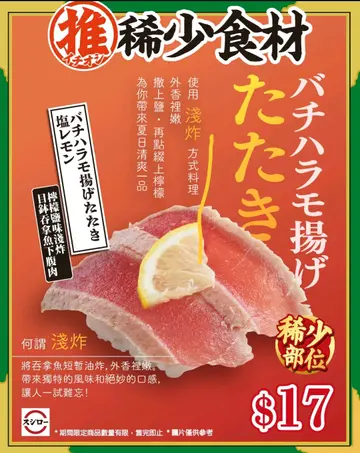 )食物:乌冬+2炙烧熟虾+2炙烧三文鱼(下午茶餐40)正常好食柠檬浅炸目钵吞拿鱼下腹肉17话系稀有部位,试下佢,有少少筋,仲有浅炸唔太食得出,试下炙烧返应该会好食啲银鳕鱼双味17又系试新嘢,有啲惊喜,肉质嫩滑,如果可以再烧耐啲会更加香之前都喺启德食过另外一个炙烧嘅嘢,唔知系咪规定烧几耐,都系烧耐啲会香啲环境:有一处无伤大雅嘅家私瑕疵,但更大嘅问题系所有分店都有嘅问题:啲杯底永远系花晒,但系密胺杯系胶杯嚟,一系换其他安全物料,一系唔好用啲硬刷去刷,呢个问题希望可以所有分店都搞搞佢服务:要赞下啲职员全部好nice啰,我帮衬𠮶段时间遇到𠮶啲,带位+兜售中拖罗、点盘、收银、帮手改单嘅职员,全部都well trained,系其他分店嘅水平之上,嗌号码、攞林sum嘢嘅职员就同分店水平一样。嗌号码嘅职员后来喺改单𠮶段时间好主动咁去帮排我后面𠮶一位顾客去自助收银机埋单呢一点系可以赞嘅。中间有段小插曲就系我唔记得咗用券,啲职员全部系好有耐心咁样帮我取消张单再入过
