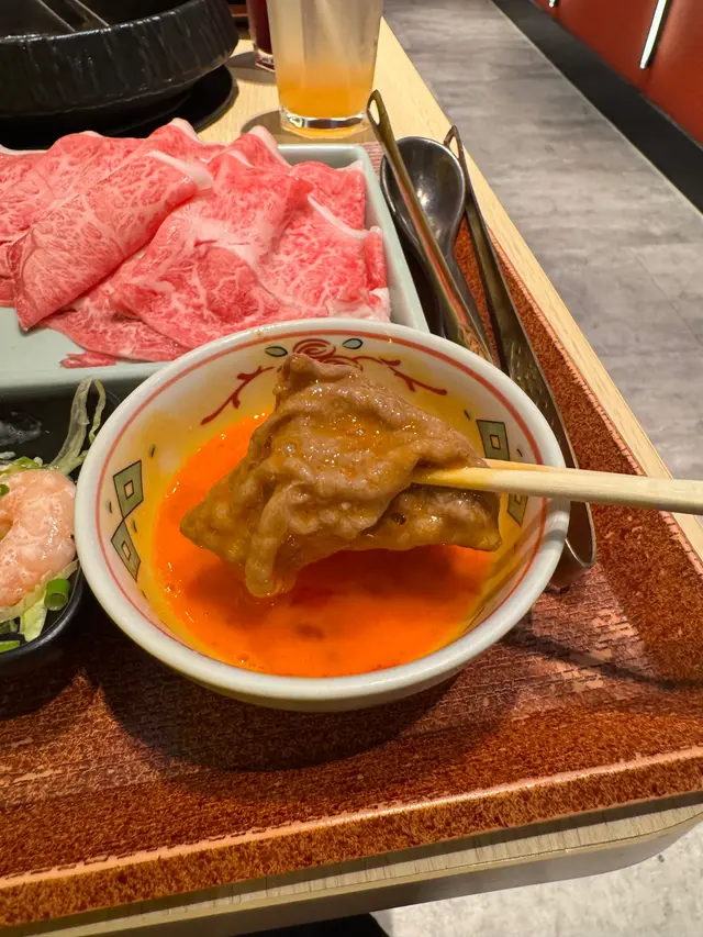 配埋佢哋秘製嘅壽喜燒汁,真係食到我停唔到口!每塊肉都沾滿蛋漿,滑溜到不得了!