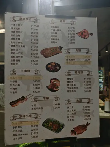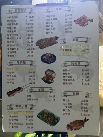 夜猫。烧真系元朗宵夜界嘅一大惊喜!😋 老板每日都会亲自去街市拣选最新鲜嘅食材,保证每一样都新鲜到爆!🦑🦐 你一入到去就闻到阵阵烧烤香味,真系令人食指大动!🔥讲到必食推介,点可以唔提佢哋嘅时令海鲜!🦪🦞 每次都会有唔同选择,今次我试咗蒜蓉粉丝扇贝同埋蒜蓉花甲,啖啖都鲜甜多汁,蒜香味浓郁,粉丝吸晒精华,真系一流!😮💨夜猫大鸡髀都系必食之选!🍗 外皮烧到金黄香脆,入面肉质嫩滑多汁,咬落去仲有肉汁爆出嚟,完全唔会鞋口,食完一只仲想再encore!🤤香脆豆卜都好有惊喜!🧆 外层炸到脆卜卜,入面豆香浓郁,配埋特制酱汁,简直系小食界嘅王者!😎爆蒜烤茄子都唔可以错过!🍆 茄子烧到软腍入味,蒜蓉铺满面,香气四溢,食落去又唔会太油腻,啱晒钟意食蔬菜嘅朋友!🥰一夜干马友真系超正!🐟 外皮微脆,鱼肉咸香有层次,食完仲想打包返屋企!🍺其他串烧都好有水准,牛肉串、盐烧牛舌串、猪大肠串、孜然羊肉串全部都烧得啱啱好,香口又唔会太干,孜然味同辣味都好突出🥩🌶️海苔虾胶串同玉子烧都系小清新之选,虾胶弹牙,玉子烧甜甜地,食完好满足!🍤🍳最后一定要试埋焦糖菠萝,烧到微焦,甜中带酸,食完好解腻,完美收尾!🍍总结嚟讲,夜猫。烧真系元朗宵夜必去之选,食材新鲜,味道出色,价钱合理,无论同朋友聚会定自己独食都一样咁开心!😆 下次一定会再嚟支持!…查看更多