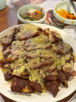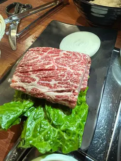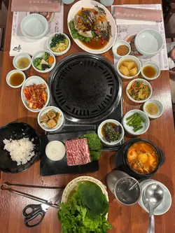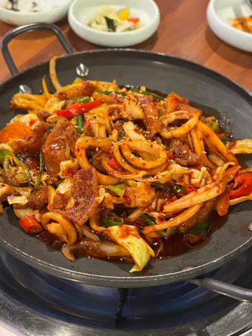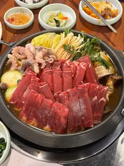 大大份韩国菜🇰🇷星期日晚市时间嚟到,见近8成客人都系韩国人 ~同好友们一行4人,叫咗3道菜式,每一样上台时都见到系好大份,有少少吓亲🤯🥘烤牛肉章鱼火锅 $480目测有超过20片牛肉卷,蔬菜份量都冇姑寒,真系4个人食呢个锅再配饭都够饱。一整个配搭系好清、相对健康,好似自己系屋企整嘅牛肉娃娃菜豆腐锅(我系会加韩式辣酱做汤底)。朋友力推话个汤好好饮,我听佢讲完都饮咗少少,真系唔油、少少似牛骨汤。可惜嘅系牛肉片相当瘦,再加上煮得太老,变咗煲汤肉。🐷蒜蓉酱韩式猪手 $370呢度嘅猪手唔似韩国猪脚小姐(Myth Jokbal) 咁有得拣份量。只系想讲韩式猪手嘅猪皮真系世一,连食咗几嚿!由于我哋食唔晒嘅关系,朋友就拎咗剩低嘅返屋企「加料」~ 😝烤鱿鱼豚肉 $350 就系想像到嘅味道,同埋最安全嘅选择🫡…查看更多