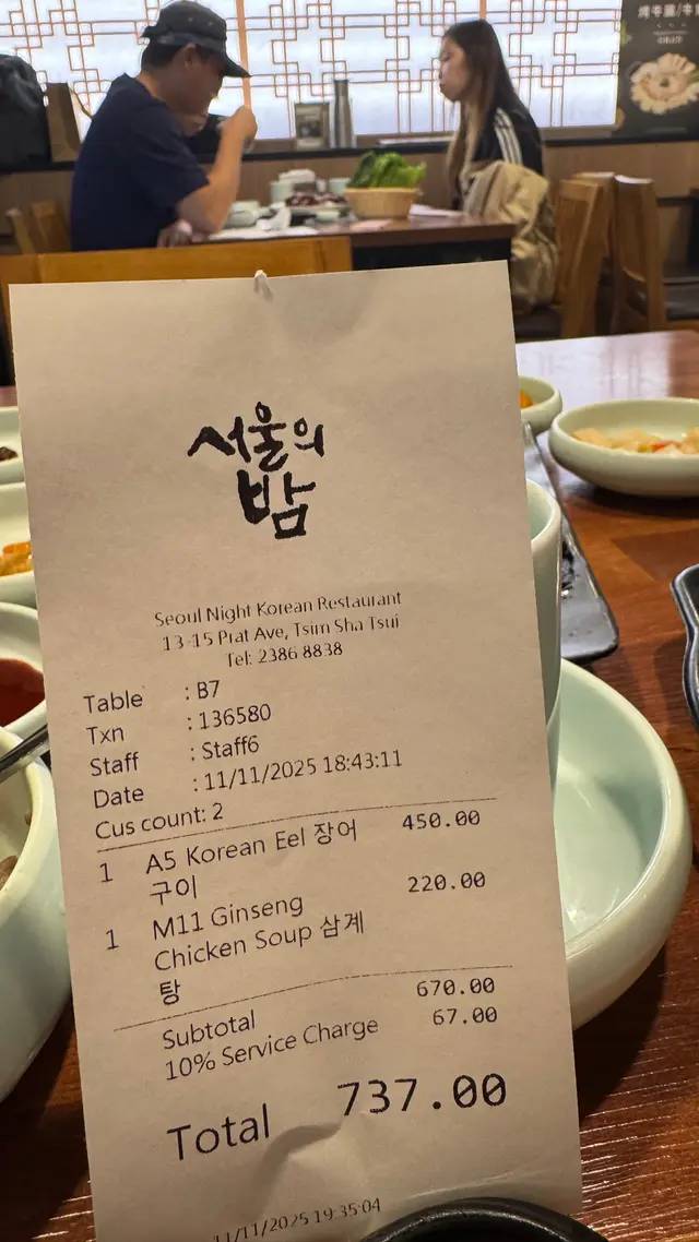 呢晚嚟咗呢間喺尖沙咀由韓國人經營嘅韓國🇰🇷餐廳食晚餐🤣我哋簡單叫咗兩樣食物🤩;坐低🪑冇耐就上咗好多碟韓國🇰🇷泡菜可以食🤣$450「烤韓國🇰🇷淡水鰻魚 한국산 민물 장어구이 Korean Fresh Water Eel」:有一次喺韓國🇰🇷出差嘅時候去咗其中一個代理商喺離開首爾大約一個鐘頭車程嘅比較偏遠鄉下地方嘅 office 開會,開完會韓國🇰🇷代理商仲買到一條喺韓國山溪河生長嘅野生鰻魚,用炭燒嚟食,超級美味🤩,咁喺呢間餐廳嘅菜牌第一頁就見到有「韓國淡水鰻魚」,咁就叫嚟試吓🤩;我仲以為係生鰻魚自己燒烤,原來餐廳已經燒咗仲切開成一件件,鰻魚燒得香口又乾身,沾韓國🇰🇷辣椒醬食,別有一番風味🤣$220「蔘雞湯」:材料包括有大小適中嘅雞一隻、糯米、高麗人蔘、紅棗同埋蒜頭等,材料好豐富🤩,雞湯非常鮮味,雞肉煲得好軟熟🤣…查看更多