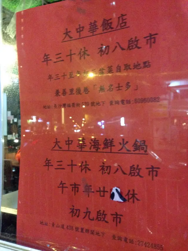 大中華火鍋專門店 (长沙湾) 网址: https://s.openrice.com/QrLS0KrW800 地址: 香港長沙灣青山道438號麗群閣地下1-4號鋪 电话: +852 27424855