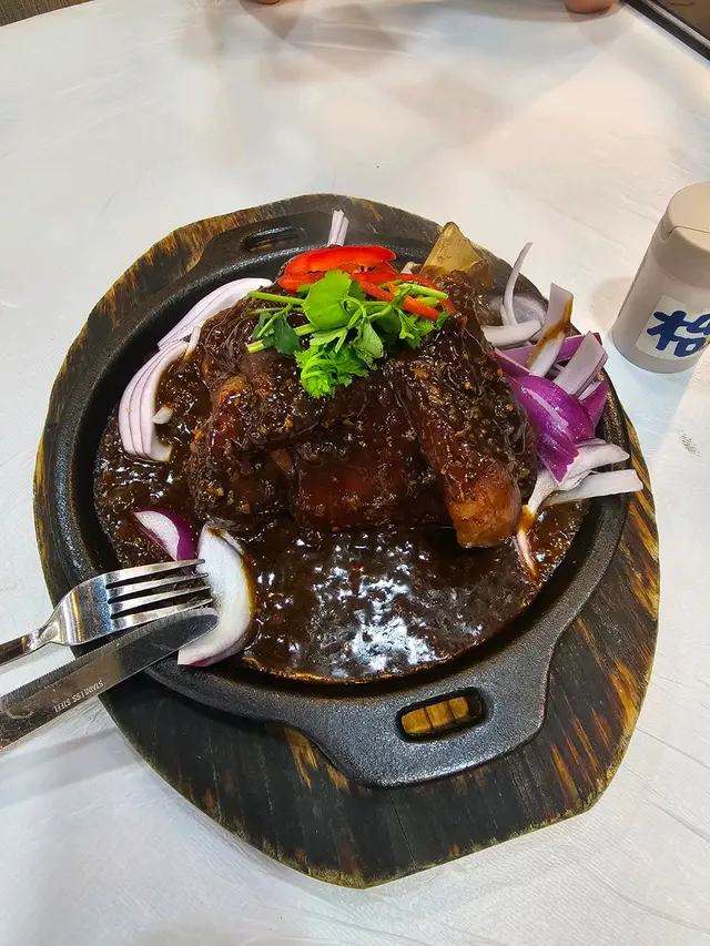 同家人食飯,突然好想食黑椒豬手,一諗到黑椒豬手,就會諗到大中華。大中華入邊環境普通,但坐位闊落,舒適,冷氣唔會太凍,又唔會過熱。因為人數唔多,只叫咗1份黑椒豬手($165),1份海味雜菜煲($100),1份煎蠔烙($100)黑椒豬手超諗,黑椒汁調得好濃郁,鐵板上夠晒熱,超有水準。海味雜菜煲,味道正常,但份量超大。蠔烙份量都偏大,蠔仔都偏大隻,味道正常。總結,黑椒豬手必食,其他小菜味道正常,份量都偏向大份,性價比都幾高,必定會再嚟。…查看更多