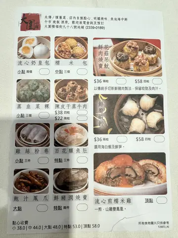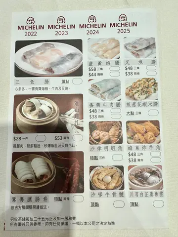 🥢 Dim Sum Highlights — A Culinary Experience Worth Booking EarlyReservations required at least one month in advance.• 莲子枣皇糕: Multi-layered with lotus seeds; texture leans 粉 over 弹. Gentle and nostalgic.• 陈皮牛肉饺: Beef ball reimagined as a dumpling, lifted by fragrant aged tangerine peel.• 炸银急仔: Crispy anchovies with a touch of spice—simple, addictive.• 菠菜梨形咸水角: Pear-shaped with crispy skin and soft pork-spinach filling. Playful and well-balanced.• 冬菇鱿鱼烧卖: Siu mai topped with mushroom and squid; chewy, briny, and elevated.• 三味肠粉: Char siu, beef, prawn—classic trio, competently done but not standout.• 炸扎蹄: Bean curd roll with shrimp roe; layered, crisp, and umami-rich.• 火枪叉烧: 30/70 fat-to-meat ratio, torched tableside for caramelized perfection.• 煎面糯米鸡配生蛋黄: Pan-seared with raw egg yolk on top—rich and modern.• 凤皇饺: Squid ink skin with shrimp and egg white filling—elegant and refined.• 沙翁: Oversized and dense; visually bold but skippable.• 煎白糖榚: Lightly sweet, sponge-like finish—simple and comforting.…查看更多