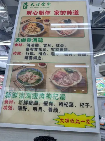 今日和朋友前往铁铁路博物馆参观,参观过后在旁边找了一间地道街坊粉面餐厅。这一间的人气非常满,周边都是街坊生意,由入座一刻到食完一刻都keep住有大量的市民进食。餐厅有几款主打项目。顺带一提,原来可以另外加上枸杞,另加费用,听到很多街坊朋友都叫额外再加$加枸杞。最后我们叫了以下食物1.招牌家乡黄酒鸡汤($50)他们的招牌菜之一,家乡黄酒鸡汤,鸡用上清远鸡,非常结实,且肉味浓郁,配上红枣,枸杞,台湾黄花菜,配上淡淡自家制的清香的黄酒,非常好吃。2.花胶海参鸡汤( $70 )另外亦叫了一个花胶海参鸡汤,十分养颜,女士们必备,花胶有两大条,海参有数小粒,配上大量满满的清远鸡,是家的味道。3.必食牛三宝( $60/例牌)牛三宝,包括有牛筋,牛腩,牛肚。牛味非常浓郁,且牛肚爽口,牛腩肉味浓郁,和含有满满骨胶原的牛筋。4.蟹籽鲜虾云吞($48)云吞皮薄馅靓,馅料用上大大粒的爽口虾仁,配上爽口的孩子,味道不错。5.油菜(+$15 )6.冻柠茶(+$3 )…查看更多