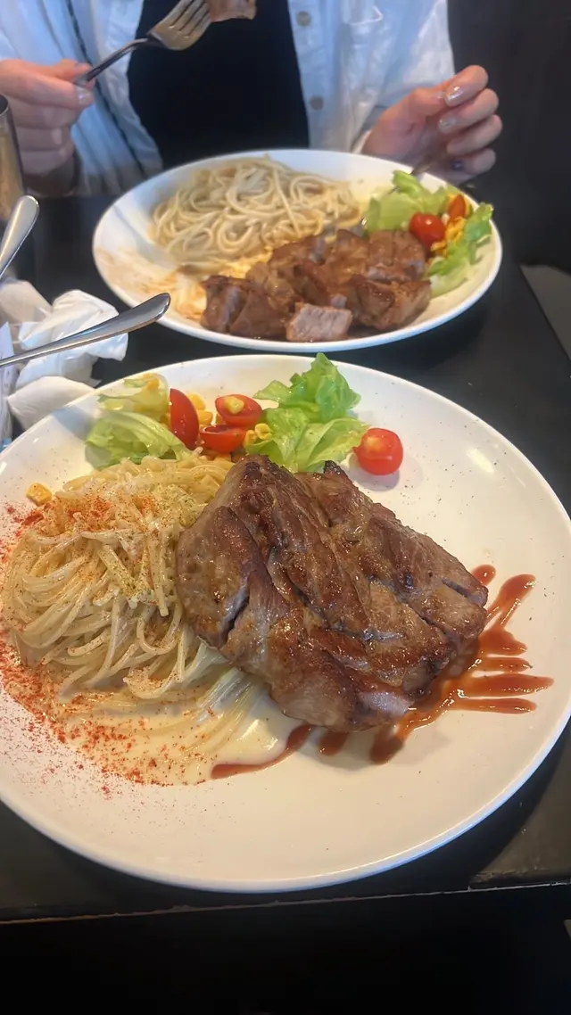 今次決定6點前就去到,估唔到6點去到已經滿座,都係要排隊🙈好彩最終都食到我地想食嘅野🥳紐西蘭牛仔柳配薯條牛仔柳有兩大塊,份量非常充足🍖你地揀左7成熟,牛柳唔會過生,食落非常淋身😎牛仔柳兩面煎到有少少脆,肉味濃郁,食完大滿足😆炭燒黑毛豬配意粉黑毛豬就無牛仔柳咁大塊,都係煎到好香脆,比起牛仔柳有咬勁,意粉用忌廉汁煮過,感覺上淨係食個意粉都好滿足😋由於兩款肉一齊食,所以感覺上黑毛豬嘅味就係無牛仔柳咁突出,但意粉方法就令佢加返唔少分數🤪入座後會送上一碗餐湯,今次係薯仔湯,餐湯非常足料,有唔少薯仔粒查看更多