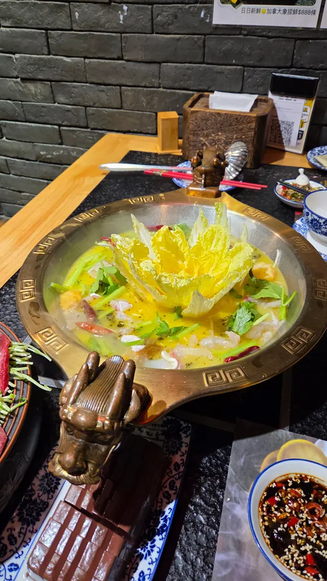 火鍋店以中國風裝修十分匹配,門口以黑金配金色花紋嘅招牌好搶眼。餐具都配上中式藍花紋,九宮格調味盆,龍頭火鍋煲都十分有中式文化感。用QR code 落單,叫加湯非常方便😊🔸️新品推介花開富貴龍皇酸香湯$308 ~ 娃娃菜砌到成朵花咁🤩。超吸眼睛呀,湯底酸酸地似酸菜魚嘅味道。 有酸菜,豆卜同埋大量牙菜吸曬湯底嘅味道😋 鍋內放入龍躉肉啖啖肉😋🔸️大滾友牛肉拼盤細$428~ 本地手切牛頸脊,牛肉粒,封門柳,牛舌,金錢展,口感各有特色,花雕酒浸牛肉更添獨特香味。每款約有5-6件份量夠晒兩人分享😊🔸️蟹黃餃四粒$78 ~ 皮薄餡靚粒粒飽滿,食落蟹黃味濃郁超正🤤🔸️手打鵝肝墨汁墨魚丸 $72 ~ 墨魚丸很彈牙中間包住粒鵝肝,味道上有創意。🔸️滑捋捋雙併:手打黑松露墨魚滑&瑤柱乾貝滑$148 ~ 兩款都是用墨魚滑彈牙爽口,黑松露味勁香濃。要瑤柱乾貝比較淡味一點。 🔸️鴨血$68 ~ 口感彈嫩滑溜。🔸️萵荀$58 ~ 吸曬湯底,爽脆可口。🔸️蓮藕片$38 ~ 爽脆同個湯底好夾。🔸️自家制足料竹蔗茅根$78 ~ 材料十足,清甜下火,打邊爐必選,一樽都分到5杯架。…查看更多