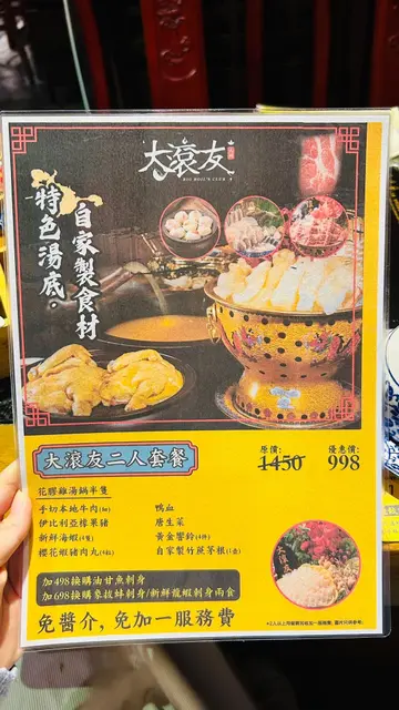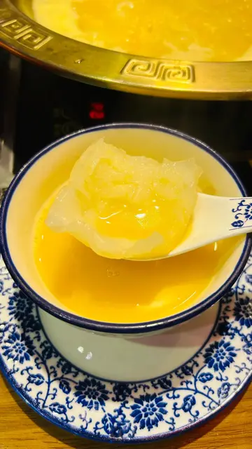 间中就会去大埔大滚友打边炉,中国宫廷式装修,一入门口已有张金闪闪皇帝龙椅俾人打卡登基,尽显气派。 今次汤底选了半只花胶鸡汤锅,汤底呈清澈的淡金黄色,鸡肉软嫩多汁,汤头滑顺浓郁,花胶养颜美容,释放的胶质让汤底略带黏稠感大滚友牛肉拼盘(细) 肉材有人手切吊龙、本地手切牛颈脊、澳洲和牛金钱展、美国顶级雪花肥牛、牛黄喉、牛肉粒和牛舌花。在清甜鲜美的花胶鸡火锅汤底中烫食不同牛肉部位,能突出食材原味,牛味浓厚,汤汁轻裹肉片,增添胶质的顺滑感。金屋藏娇和牛墨鱼丸手打工艺让丸子质地紧实却不失弹性,结合和牛的浓郁肉香与墨鱼的鲜甜弹牙。即炸响铃即炸后快速烫食,金黄酥脆,外脆内软,吸收鸡汤的温润甜香。黑松露蟹肉饺饺子外皮厚薄刚好,薄皮口感嫩滑,内馅扎实丰满,结合蟹肉的鲜甜与黑松露的馥郁菌香。酥炸小菇菇外观金黄酥脆,炸浆均匀裹覆菇体,内里保留菇类特有的弹性嚼感。炸支竹本身浓郁的豆香,相比即炸响铃,支竹更厚实,吸汤力强。薯粉晶莹通透,口感烟韧弹牙,更可以吸尽浓稠汤底,滋味无穷。爆浆芝士肠外层肠衣Q弹有嚼劲,内层芝士爆浆流出,集合浓郁奶香与肉香。手打蟹子鲜虾丸纯手工打造确保弹性,以新鲜虾滑为基底,混入蟹子增添鲜味。火焰焦糖豆腐花以木桶盛载的豆腐花,做法有如西式甜品焦糖炖蛋,即场洒下黄糖再倒酒,以火枪点火燃烧,将表层炙烧成焦糖脆壳,与滑溜豆腐花形成一嫩一脆的极端质感。自家制竹蔗茅根1渣草本清香缓解饱滞感,有清热祛湿功效,能调节火锅的温热性质,避免上火。…查看更多