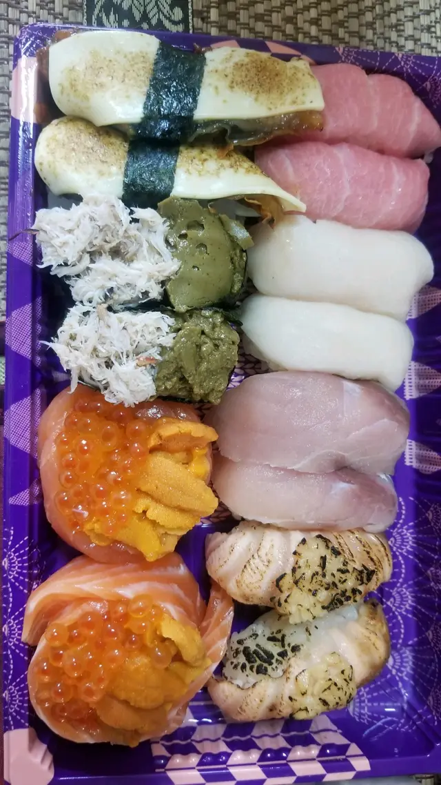 呢到8件已經$130,可能我太耐冇食貴野,所以真心覺得小貴。好啦味道方面係滿分嘅,其實我最鍾意食佢個三文魚腩刺身,但而家加咗價好貴唔捨得食佢哋又厚身、又大嚿、重三文魚味、非常鮮味!今次叫咗2件海膽壽司、2件芥辣八爪魚壽司、2件黃金魷魚壽司、同埋兩件蟹膏柱貝壽司。海膽壽司—— 足料 唔孤寒 大大嚿 鮮芥辣八爪魚壽司——大大粒 但唔夠芥辣黃金魷魚壽司—— 今日突然好想食呢個,因為黃金魷魚啲魷魚口感好特別,爽口淋身之間。蟹膏柱貝壽司—— 蟹膏好香,但係唔係用帶子刺身,所以唔夠鮮味。一直都食開佢哋雖然食評有缺點有優點,只不過係客觀嘅意見,我仍然會再幫襯佢哋~查看更多
