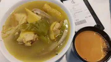 > ; 胡椒猪肚汤味道刚好,咸菜和猪肚够淋<我怕食到牙痛>,有几粒黄豆。