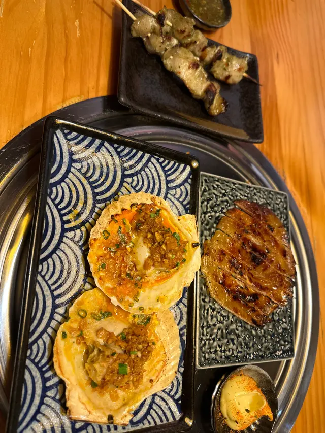 朋友約我去陀地燒,跟住個地址去,初初仲以為去錯地方,原來餐廳變咗「陀地燒 x 大眾燒肉酒場」。兩者聯乘,前者主打串燒,後者就主打燒肉。為咗應節,餐廳推出咗「陀地燒新年沖喜二人餐」,包括以下咁多款食物,都只係$288,真心抵食:雞皮串(2串) / 雞肉串(2串) / 薄切牛舌串(2串) / 招牌牛肉串(2串)/ 豬頸肉串(2串)/ 蒜芯串(2串)/土豆串(2串)/ 翠玉瓜串(2串)/ 陀地燒生蠔(2隻)/ 燒元貝(2隻) / 味淋魚乾 / 蒜茸包 /蜜糖菠蘿串(2串)個人好喜歡雞皮串,非常酥脆但唔覺油膩;燒生蠔同燒元貝都做得好出色,有蒜香之餘仲加咗啲辣菜脯,又惹味又香口;蒜蓉包亦係非常好食。另外額外再叫左雞腳筋串同藤椒魚皮。請者爽彈有咬口;後者爽脆,藤椒味酸酸辣辣啱晒我。飲品要另外叫,叫左菠蘿可爾必思同冷泡白桃烏龍茶。前者係乳酪系列有菠蘿果肉,口感不錯;後者味道比較清新。查看更多